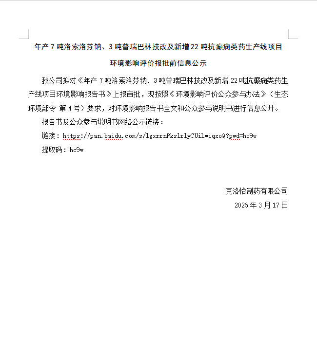 年产7吨洛索洛芬钠、3吨普瑞巴林技改及新增22吨抗癫痫类药生产线项目环境影响评价报批前信息公示